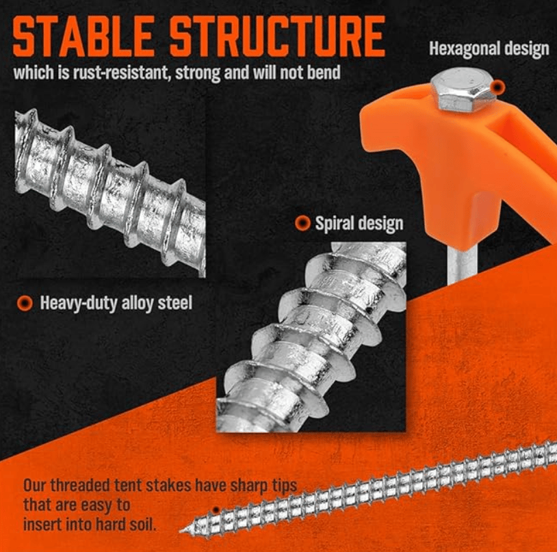 ⛺【 HIGH QUALITY & DURABLE】 Made from high-quality galvanized iron with a threaded end for easy insert and superior grip when drilling into various hard surfaces. Whether it's grass, hard soil, gravel, or anything in between, it holds securely.